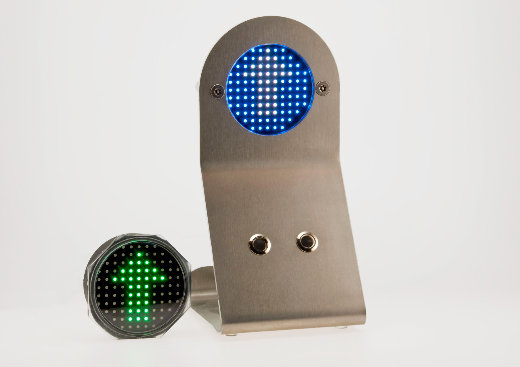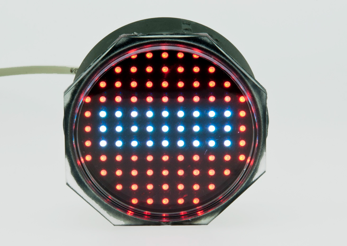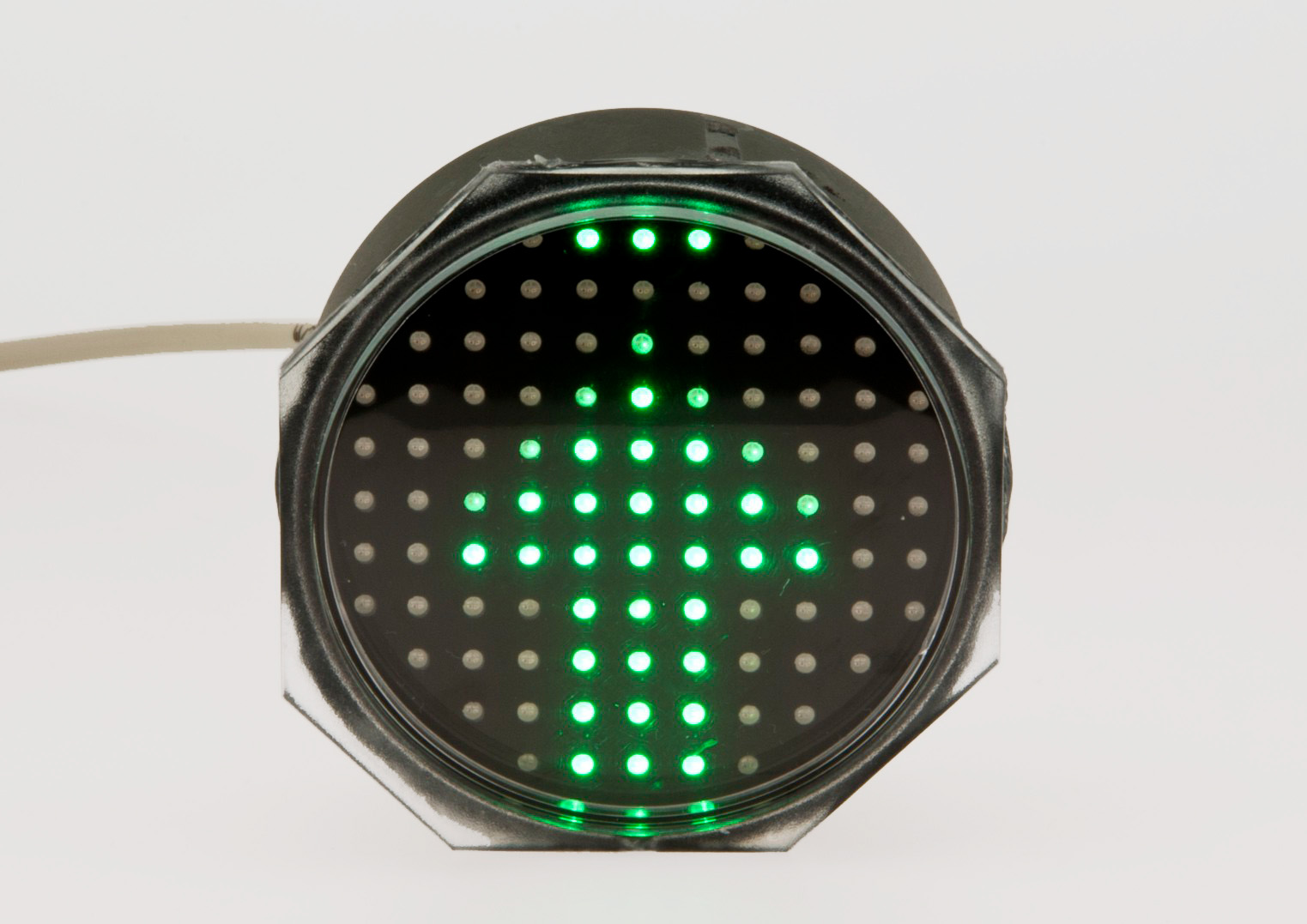 The multifunctional traffic light consists of 97 RGB LEDs. The LEDs are arranged homogeneously across the entire display surface. Each individual LED can take on any color. The displayed symbols can also be animated. The multifunction traffic light can display up to three symbols switchably. The multifunction traffic light is available with function monitoring for connection to a remote diagnostic system.