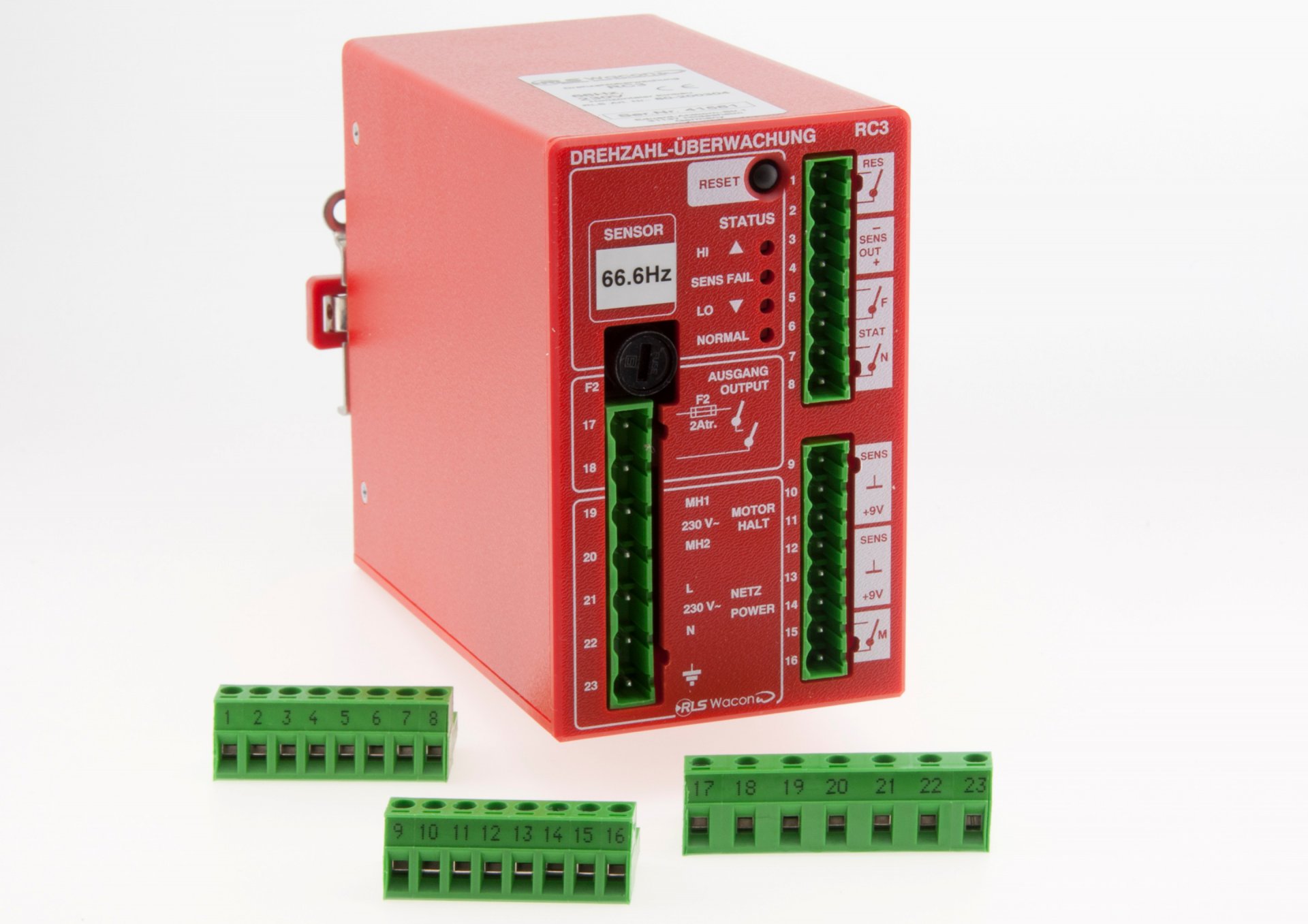 La surveillance de vitesse RC3 contrôle les trois plages de vitesse : sous-vitesse, vitesse nominale et survitesse, ainsi que l’état d’inversion du sens de rotation. Les états de danger sous-vitesse, inversion du sens de rotation, survitesse et défaillance du capteur entraînent l’arrêt du moteur. Des détecteurs de proximité inductifs peuvent être adaptés comme capteurs d’impulsions. Le capteur est alimenté par l’appareil et ne nécessite donc pas de tension d’alimentation externe. Un contact de relais sans potentiel est nécessaire pour la connexion à la commande d’escalier.