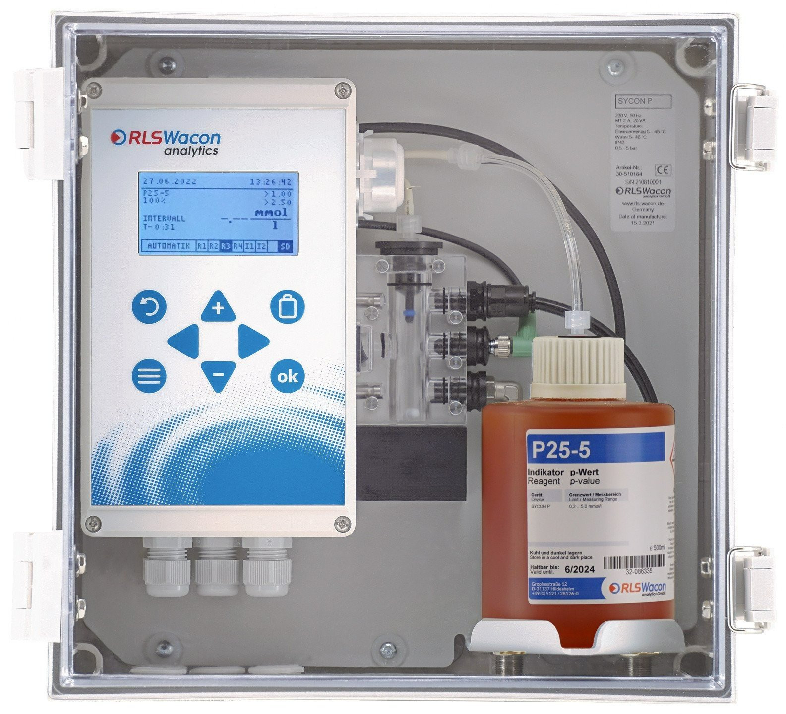 Das SYCON P ist ein Titrationsgerät zur Messung des +p-Werts. Das Online-Analysegerät besitzt neben den Üblichen Relais und Eingangskontakten eine 20 mA Strom- sowie RS485 Schnittstelle mit Modbus RTU Protokoll.